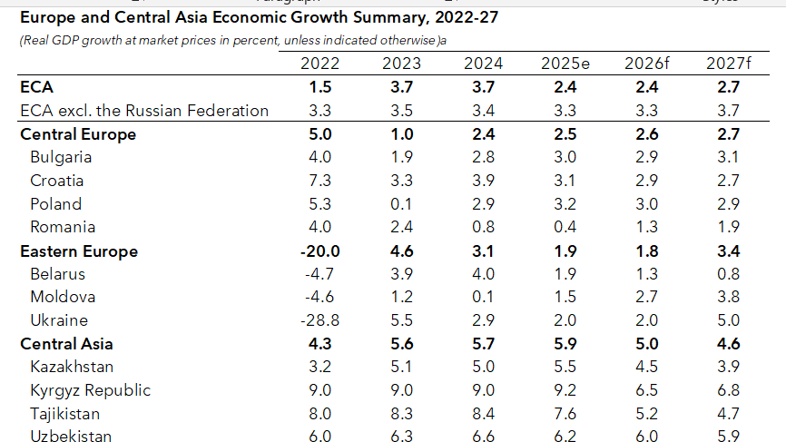La nivelul Europei Centrale, regiune în care este încadrată şi România în analiza BM, creşterea PIB este estimată la 2,5% în 2025 şi 2,7% în 2026.