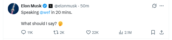 Înainte de apariția de anul acesta de la Davos, Musk a scris în glumă pe X: „Voi vorbi în 20 de minute la Davos. Oare despre ce să vorbesc?”