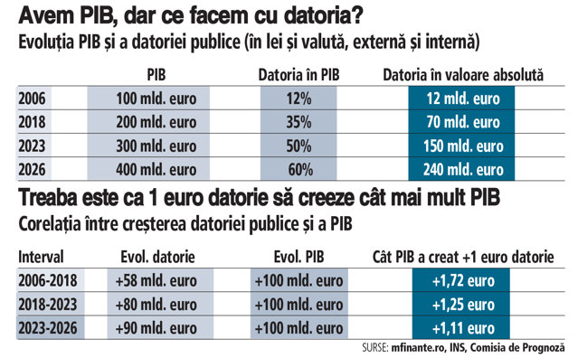 Astăzi, la 400 miliarde de euro PIB avem aproape 60% din PIB datorie publică, deci 240 miliarde de euro. Ca să adăugăm 100 mld. euro PIB în perioada 2023-2026, am crescut datoria publică cu încă 90 miliarde de euro. Deci în ultimii trei ani fiecare 1 euro datorie publică suplimentară ne-a adus doar 1,11 euro PIB. Gâfâim. Dacă ajungem ca la 1 euro suplimentar datorie să aducem la PIB mai puţin de 1 euro, atunci va fi grav. Ori accelerăm dinamica pe acelaşi euro împrumutat, ori nu ne mai împrumutăm şi scădem stocul datoriei.