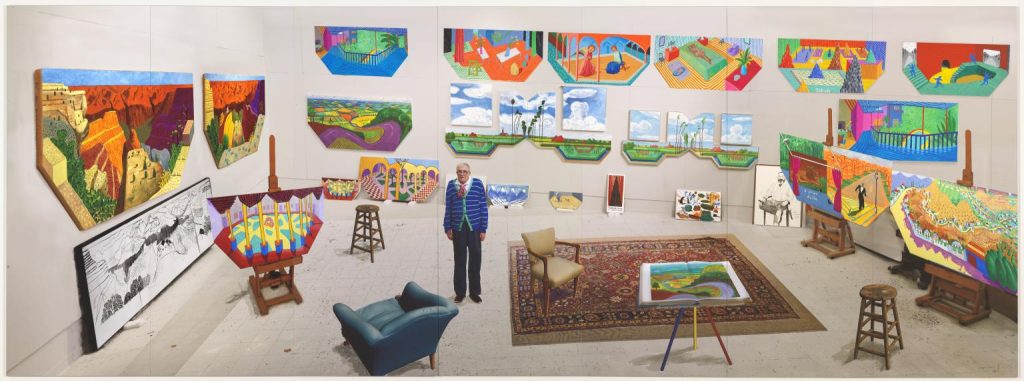 Lucrarea „In the Studio, December 2017” oferă o perspectivă inedită asupra spațiului intim de creație al lui Hockney. Această fotografie panoramică, realizată prin „îmbinarea digitală” a mii de imagini, dezvăluie nu doar atelierul artistului, ci și o explorare a perspectivei.
