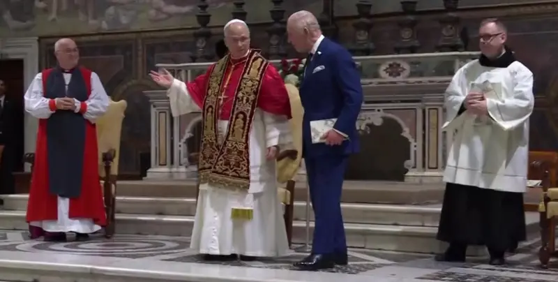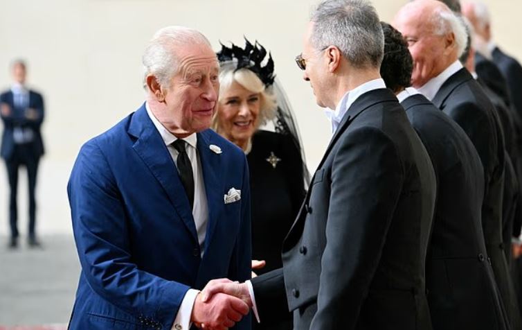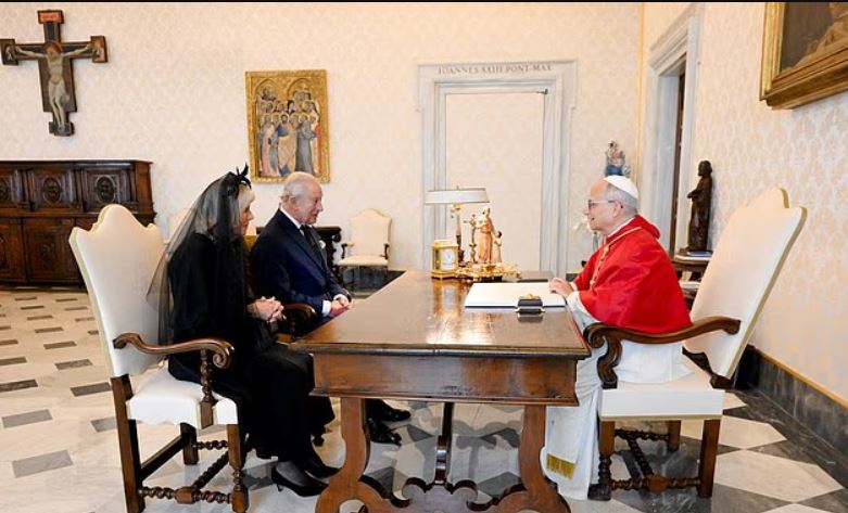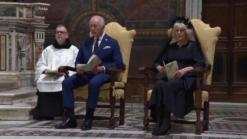 Cuplul Regal a fost întâmpinat de Regentul Prefecturii Casei Papale, Reverendul Monsignor Leonardo Sapienza. Camilla purta o rochie neagră din mătase Fiona Clare, o mantilă Philip Treacy și o broșă „raspberry pip” în formă de cruce, care a aparținut anterior regretatei Regine Elisabeta a II-a.