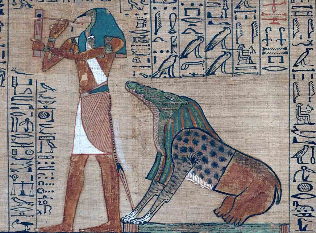 Foto: Teuth (Thoth) însuşi, Zeul Scrisului (n-am găsit o imagine în care să zâmbească). În spatele lui şade, ameninţător de atentă, Ammit (nu e ce pare a fi, e o idee, despre care vom vorbi când o să răsfoim Cartea Egipteană a Morţilor).