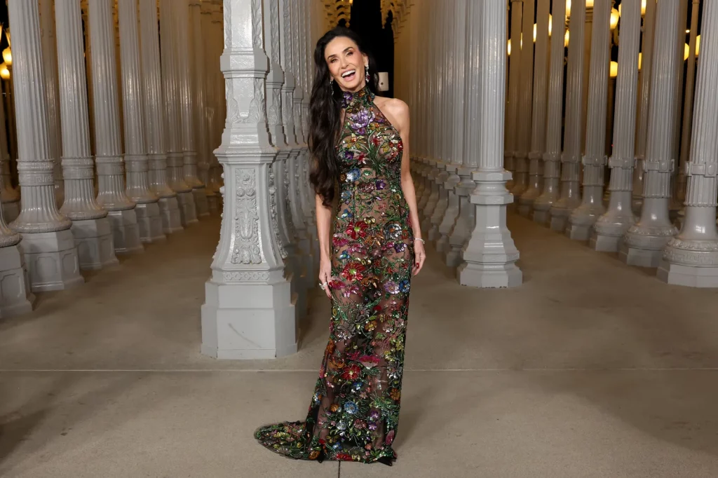Demi Moore și-a confirmat statutul de icon al modei pe covorul roșu, păstrându-și în același timp stilul feminin, elegant și sofisticat. La Gala LACMA Art + Film 2025, actrița a purtat o rochie Gucci personalizată, transparentă, decorată cu flori din mărgele și cristale în tonuri de bijuterii. Rochia halter, mulată pe corp, este un model preferat al lui Moore și, desigur, semnătura brandului Gucci, scrie Variety.