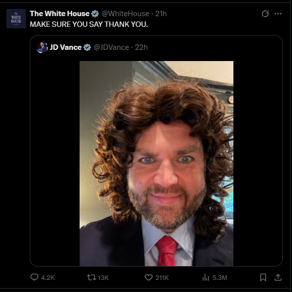 Casa Albă a participat la rândul său la gluma lui Vance și a postat pe pagina sa oficială aceeași glumă cu Vicepreședintele SUA: