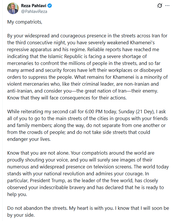 Prin prezența voastră numeroasă și curajoasă pe străzile din Iran, pentru a treia noapte consecutiv, ați slăbit grav aparatul represiv al lui Khamenei și regimul său. Am primit informații credibile care arată că Republica Islamică se confruntă cu o lipsă severă de mercenari pentru a face față milioanelor de oameni din stradă, iar până acum mulți membri ai forțelor armate și de securitate și-au părăsit posturile sau au refuzat să execute ordinele de reprimare a populației.