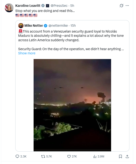 Statele Unite au folosit o armă misterioasă și puternică care i-a îngenuncheat la propriu pe soldații venezueleni, provocându-le vomă cu sânge și sângerări nazale în timpul raidului de amploare în care l-au capturat pe dictatorul venezuelean Nicolas Maduro, potrivit unui martor citat de NY Post, ale cărui mărturisiri au fost preluate de Karoline Leavitt, secretara de presă a Casei Albe, pe pagina sa oficială de X.