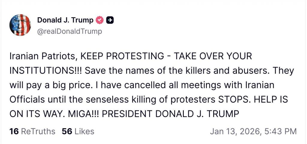 „Tuturor patrioților iranieni – continuați să protestați, preluați controlul asupra instituțiilor voastre dacă este posibil și salvați numele ucigașilor și ale agresorilor voștri… pentru că vor plăti un preț foarte mare… Tot ce le transmit iranienilor este: Ajutorul este pe drum.”