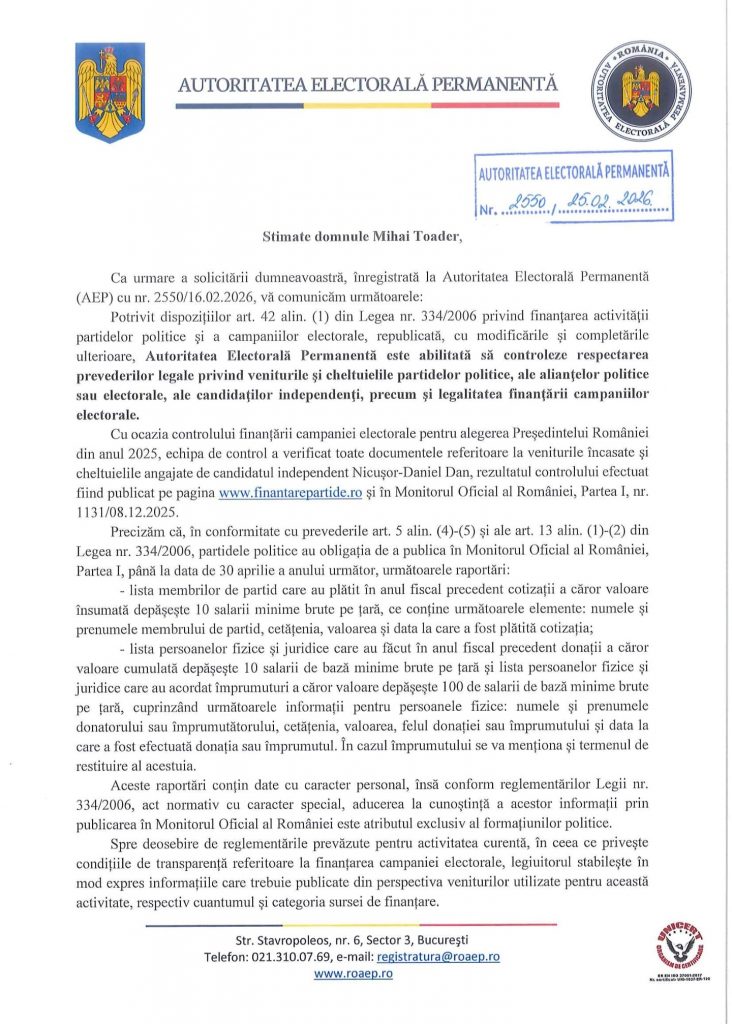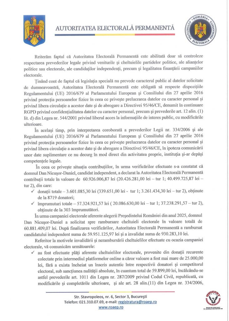 - Autoritatea Electorală Permanentă (AEP) a sesizat Parchetul general privind finanțarea campaniei prezidențiale a lui Nicușor Dan, din 2025.