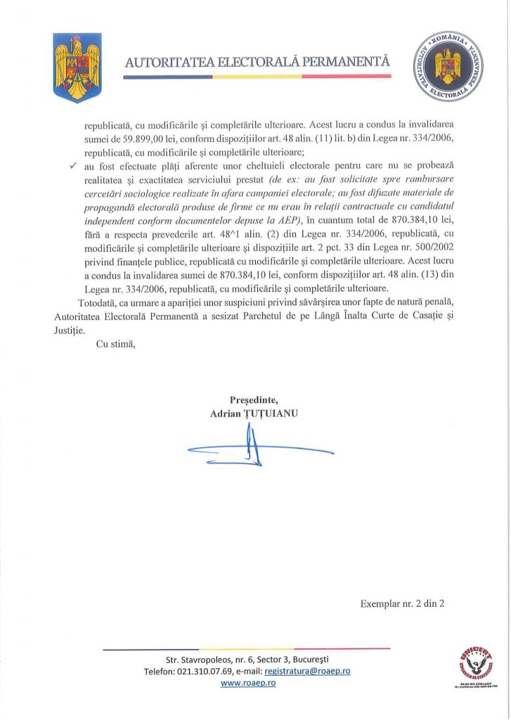 Potrivit concluziilor AEP, „au fost efectuate plăți aferente unor cheltuieli electorale pentru care nu se probează realitatea și exactitatea serviciului prestat (de ex: au fost solicitate spre rambursare cercetări sociologice realizate în afara campaniei electorale; au fost difuzate materiale de propagandă electorală produse de firme ce nu erau în relații contractuale cu candidatul independent conform documentelor depuse la AEP), în cuantum total de 870.384,10 lei, fără a respecta prevederile” legale.