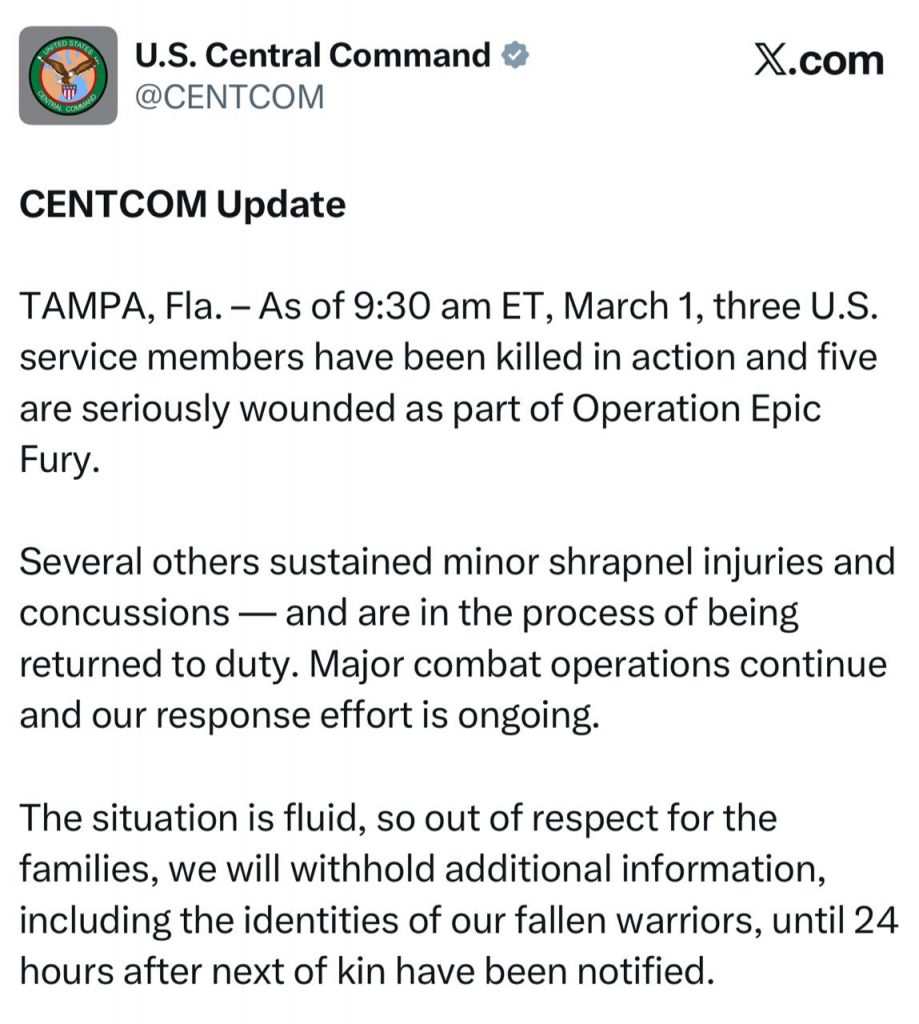 „Până la ora 9:30 ET (16:30 ora României), în data de 1 martie, 3 militari americani au fost uciși în acțiune, iar alți 5 sunt răniți grav, în cadrul Operațiunii Epic Fury. Mai mulți au suferit răni ușoare de șrapnel și comoții cerebrale și sunt în proces de revenire la serviciu. Operațiunile majore de luptă continuă, iar eforturile de răspuns sunt în derulare. Situația este fluidă, astfel încât, din respect pentru familiile lor, vom amâna furnizarea de informații suplimentare, inclusiv identitatea eroilor noștri căzuți, până la 24 de ore după notificarea rudelor de gradul întâi”, anunță CENTCOM.