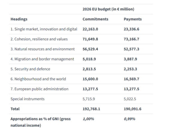 - Bugetul pentru 2026 se ridică la 192,8 miliarde EUR în angajamente totale și 190,1 miliarde EUR în plăți totale.
