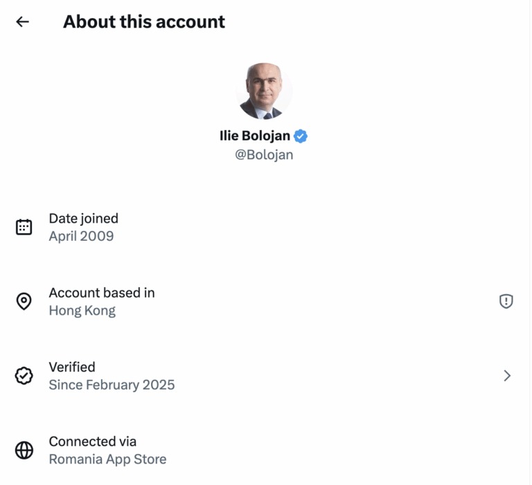 Verificările realizate asupra utilizatorilor români ai platformei arată că Premierul Ilie Bolojan are contul administrat din Hong Kong, nu din România, așa cum este cazul la Președintele Nicușor Dan.
