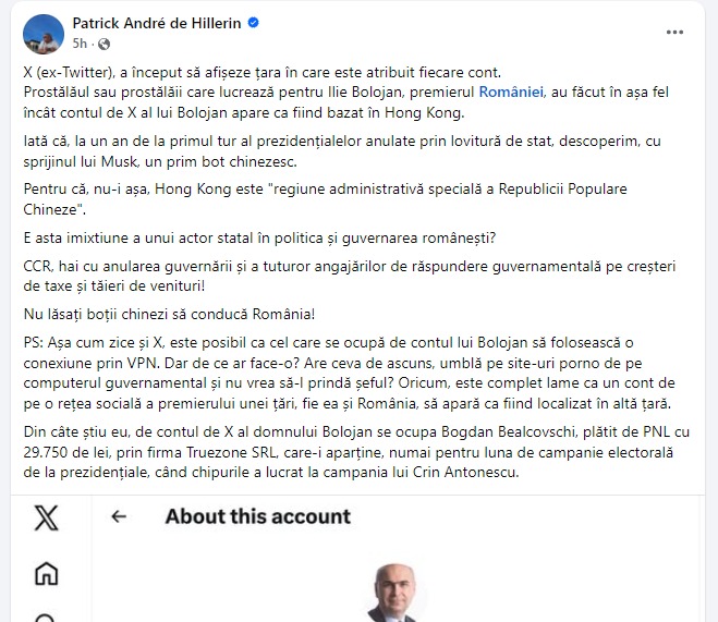 PS: Așa cum zice și X, este posibil ca cel care se ocupă de contul lui Bolojan să folosească o conexiune prin VPN. Dar de ce ar face-o? Are ceva de ascuns, umblă pe site-uri porno de pe computerul guvernamental și nu vrea să-l prindă șeful? Oricum, este complet lame ca un cont de pe o rețea socială a premierului unei țări, fie ea și România, să apară ca fiind localizat în altă țară. Din câte știu eu, de contul de X al domnului Bolojan se ocupa Bogdan Bealcovschi, plătit de PNL cu 29.750 de lei, prin firma Truezone SRL, care-i aparține, numai pentru luna de campanie electorală de la prezidențiale, când chipurile a lucrat la campania lui Crin Antonescu”.