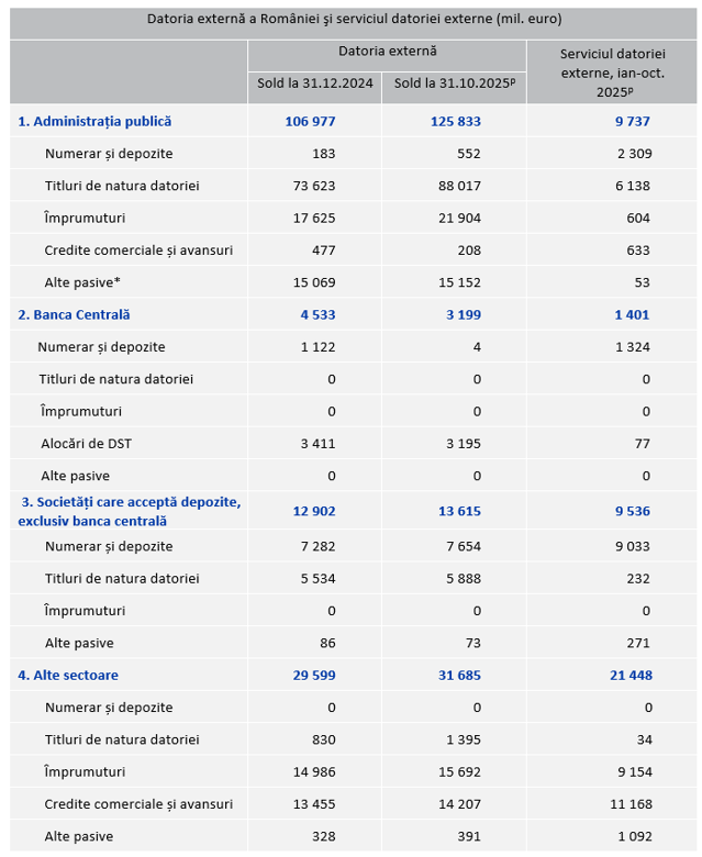 - Datoria externă totală a României a crescut în primele zece luni din 2025 cu 22 miliarde euro, până la 225,5 miliarde euro, din care datoria pe termen lung reprezintă 78,7 %.