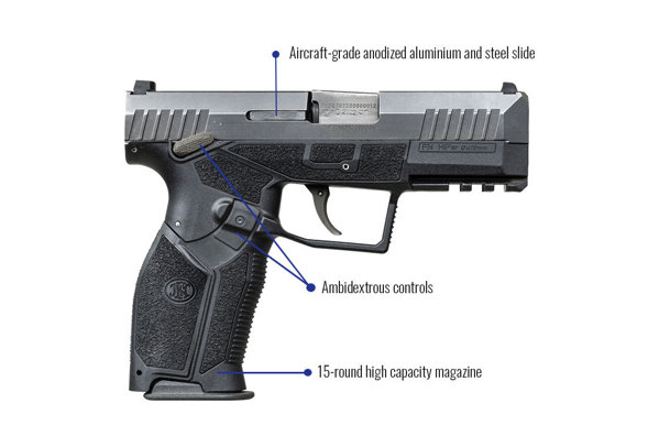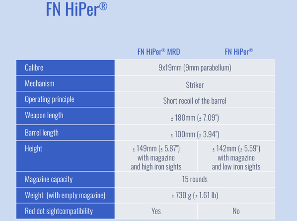 FN HIPER – este o armă cal. 9×19 mm proiectată pentru ergonomie şi control ridicat, având mâner adaptabil cu spate interschimbabile şi comenzi ambidextre. Designul include un ax al ţevii poziţionat mai jos pentru a reduce reculul şi ridicarea armei la tragere, ceea ce îmbunătăţeşte precizia şi controlul. Pistolul foloseşte un sistem cu percutor (striker-fired), are o capacitate a încărcătorului de aproximativ 15 cartuşe şi este construit pentru fiabilitate în condiţii dificile, integrând mai multe sisteme interne de siguranţă şi posibilitatea de demontare fără apăsarea trăgaciului.