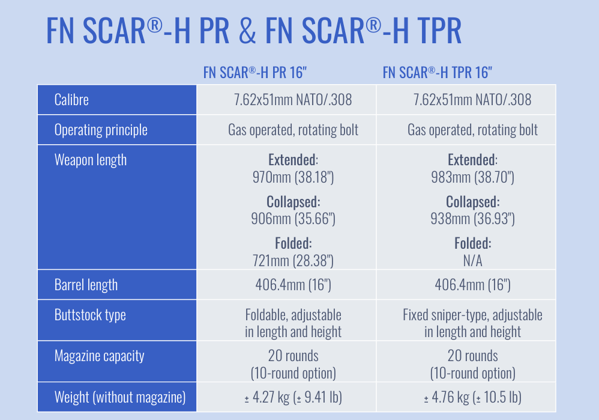 „Familia SCAR” – Deşi sunt mai multe tipuri de arme în această categorie, în funcţie de necesităţile armatelor, FN SCAR H PR este una dintre cele care se potriveşte cerinţelor Armatei Române. Este o puşcă de precizie semiautomată calibru 7,62×51[1]1 mm NATO, dezvoltată de compania belgiană FN Herstal pentru trăgători de elită (designated marksmen) şi echipe de lunetişti. Arma face parte din familia SCAR şi este proiectată pentru tragere rapidă şi precisă atât la distanţe lungi, cât şi la distanţe medii, având un sistem de operare cu gaz şi o construcţie modulară robustă, dar relativ uşoară. Modelul include un trăgaci match în două etape, o ţeavă grea pentru precizie ridicată, precum şi şine Picatinny pe mai multe părţi pentru montarea opticii, dispozitivelor de vedere pe timp de noapte şi altor accesorii. Puşca are, de asemenea, un pat rabatabil şi reglabil, ceea ce permite adaptarea armei la utilizator şi la diferite situaţii tactice. FN SCAR H -MK2 este o altă armă din aceeaşi familie, proiectată pentru misiuni de luptă intense, oferind foc semiautomat sau automat şi o construcţie modulară care permite schimbarea rapidă a ţevii (de exemplu 13″ sau 16″) în mai puţin de cinci minute. Puşca este echipată cu şine Picatinny pe toate laturile pentru montarea opticii şi a accesoriilor, un pat rabatabil şi reglabil pentru adaptarea la utilizator şi poate fi echipată cu lansatorul de grenade FN 40GL MK2 de 40 mm pentru putere de foc suplimentară.