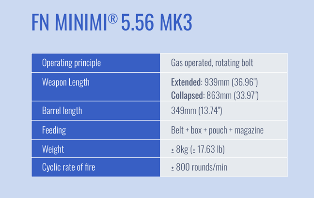 FN MINIMI este deja cunoscută în categoria mitralierelor uşoare. Arma este o evoluţie a versiunilor anterioare MINIMI, folosite de armate din peste 70 de ţări, şi se remarcă prin fiabilitate ridicată în luptă, ergonomie îmbunătăţită şi mobilitate mai bună. Modelul Mk3 are un pat reglabil (lungime în 5 poziţii şi suport pentru obraz în 6 poziţii), bipod integrat în gardă şi un mecanism de armare care poate fi acţionat cu oricare mână. De asemenea, dispune de ţevi interschimbabile rapid (scurtă sau lungă) şi de un capac superior cu şină lungă pentru montarea mai multor optice, precum combinaţii de lunetă de zi şi dispozitiv de vedere pe timp de noapte. Arma este disponibilă în mai multe variante (Standard, Para, Tactical etc.) şi poate fi echipată cu diverse accesorii certificate pentru diferite misiuni militare.