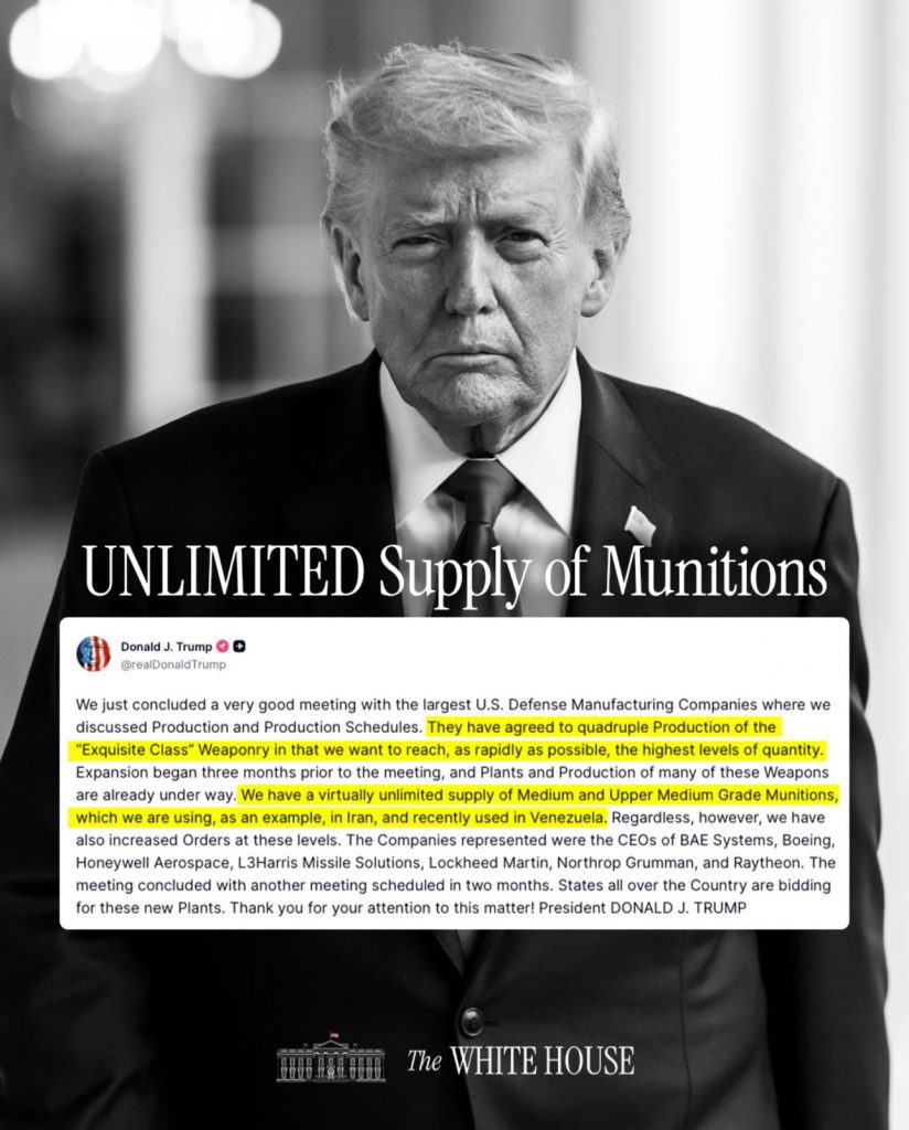 În mesajul publicat pe Truth Social, Președintele Donald Trump afirmă că Statele Unite dispun de stocuri foarte mari de muniție. El susține că rezervele de muniție de nivel mediu și mediu-superior „nu au fost niciodată mai mari sau mai bune”.