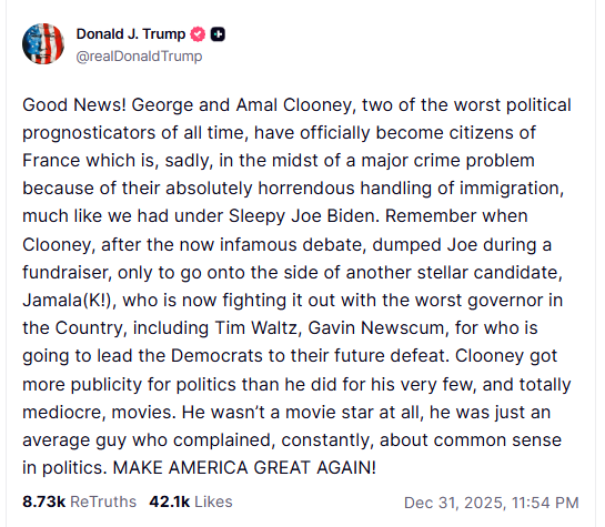 ”Vești bune! George și Amal Clooney, doi dintre cei mai slabi analiști politici din toate timpurile, au devenit oficial cetățeni ai Franței, care, din păcate, se află în mijlocul unei mari probleme de criminalitate din cauza modului absolut îngrozitor în care gestionează imigrația, asemănător cu ce am avut sub Somnorosul Joe Biden.