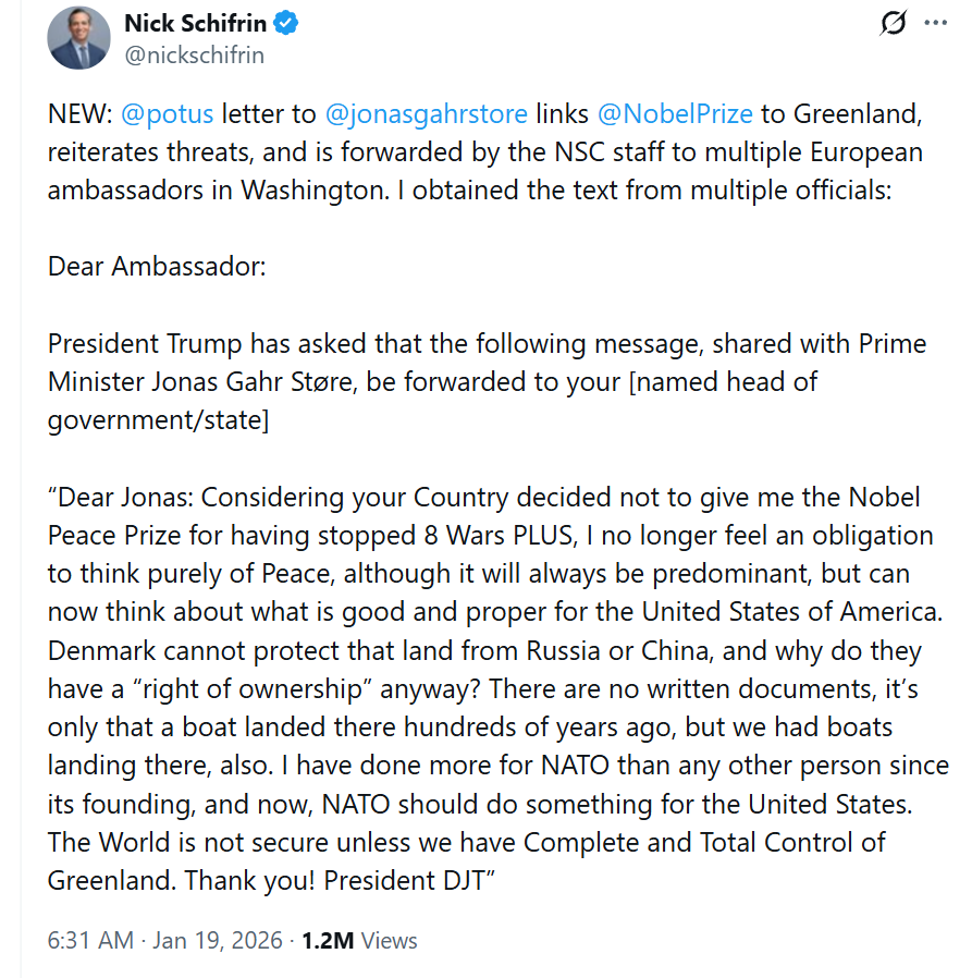 În acest document, Președintele american leagă direct refuzul Comitetului Nobel de a-i acorda Premiul pentru Pace de decizia sa de a urmări controlul total asupra Groenlandei.