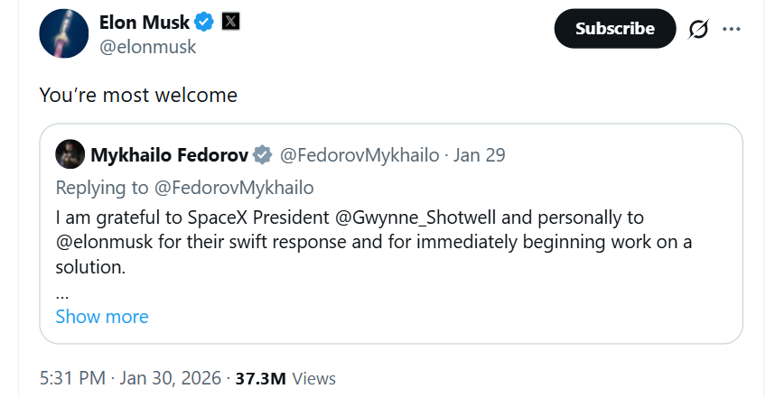 „Sunt recunoscător președintelui SpaceX @Gwynne_Shotwell și personal lui @elonmusk pentru răspunsul rapid și pentru că au început imediat să lucreze la o soluție. Decizia lui Elon Musk de a activa urgent Starlink și de a trimite primul lot de terminale în Ucraina la începutul invaziei pe scară largă a fost esențială pentru reziliența statului nostru”, la care Elon Musk a răspuns: „Cu mare plăcere”.