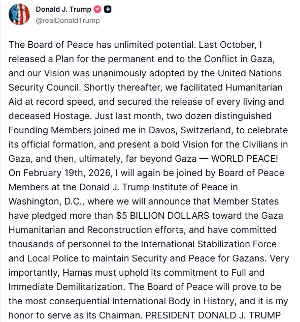 Potrivit mesajului postat de Trump, „anunțul formal” privind cele 5 miliarde de dolari va fi făcut la prima reuniune a Consiliului de Pace, pe 19 februarie, la Institutul de Pace Donald J. Trump din Washington D.C., în prezența reprezentanților celor aproape 20 de state membre.