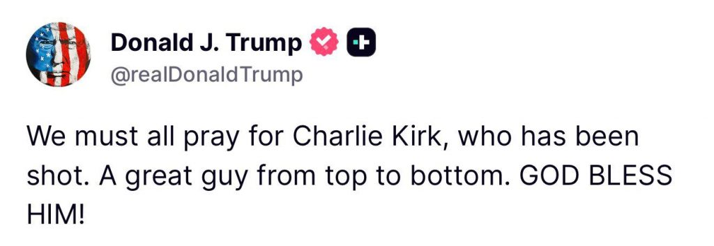 Președintele Donald Trump a postat pe platforma sa, Truth Social, sprijin pentru Kirk, afirmând: „Trebuie să ne rugăm cu toții pentru Charlie Kirk, care a fost împușcat. Un tip grozav din toate punctele de vedere. Dumnezeu să-l binecuvânteze!”.