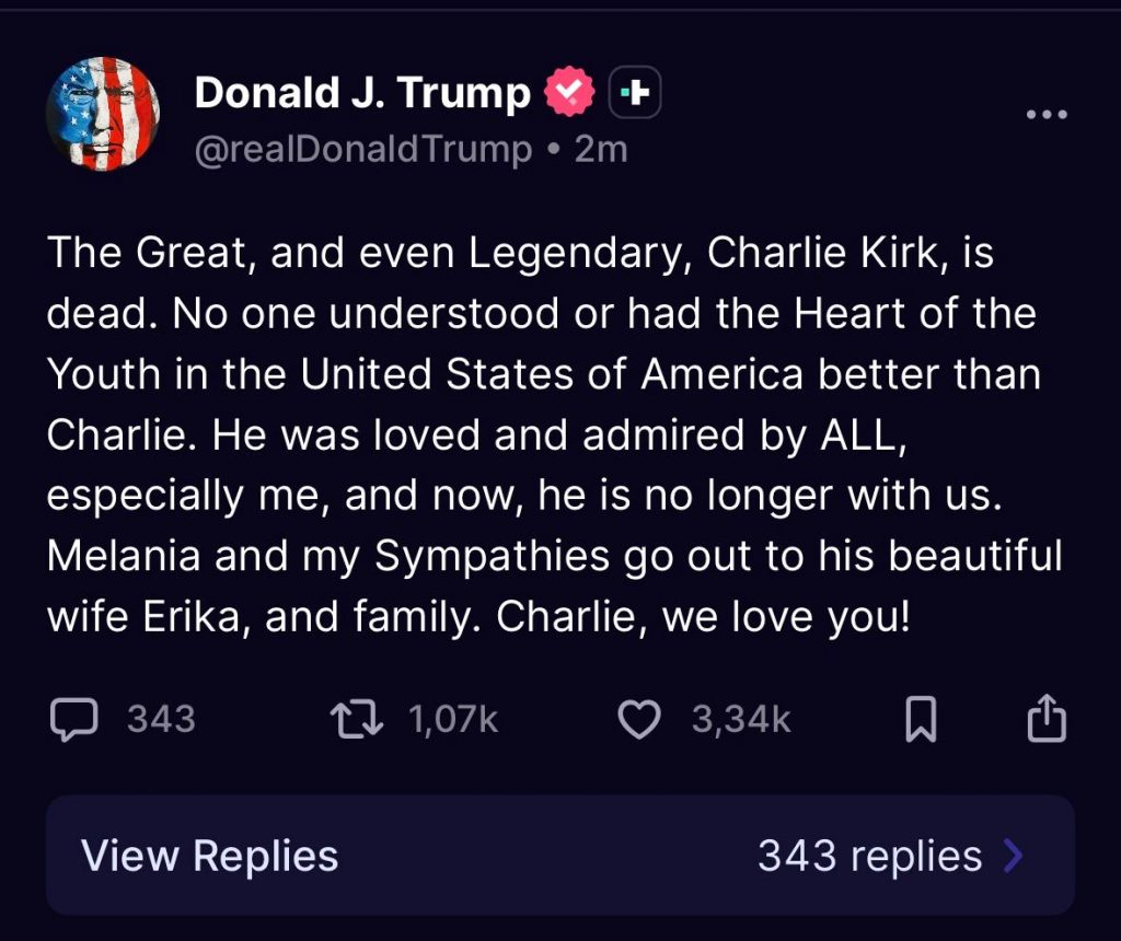 „Marele și chiar legendarul Charlie Kirk a murit. Nimeni nu înțelegea sau nu avea inima tinerilor din Statele Unite ale Americii mai bine decât Charlie. Era iubit și admirat de TOȚI, în special de mine, iar acum nu mai este printre noi. Melania și cu mine transmitem condoleanțe frumoasei sale soții Erika și familiei sale. Charlie, te iubim!”, a scris Trump pe Truth Social.
