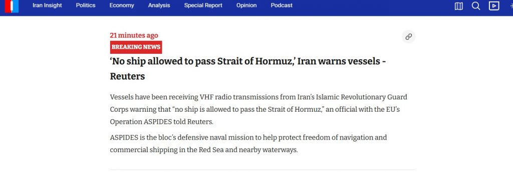 Potrivit presei iraniene, marina Gărzilor Revoluționare Iraniene anunță prin Radio VHF că închide Strâmtoarea Ormuz și „nicio navă nu are voie să traverseze”.