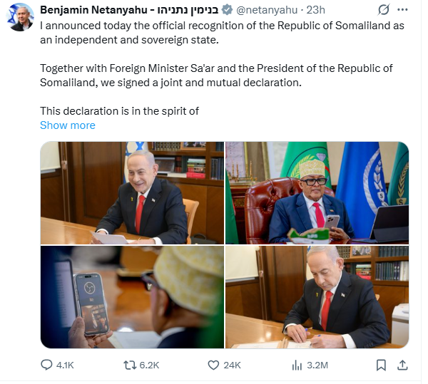 Prim-ministrul Benjamin Netanyahu a anunțat că Israelul și Somaliland au semnat o declarație comună care stabilește relații diplomatice complete. Netanyahu a spus că declarația comună semnată de el, ministrul israelian de Externe Gideon Saar și Președintele Abdirahman Mohamed Abdullahi este „în spiritul Acordurilor Abraham din 2020” – mediate de Administrația Trump pentru a stabili legături oficiale între Israel și state arabe.
