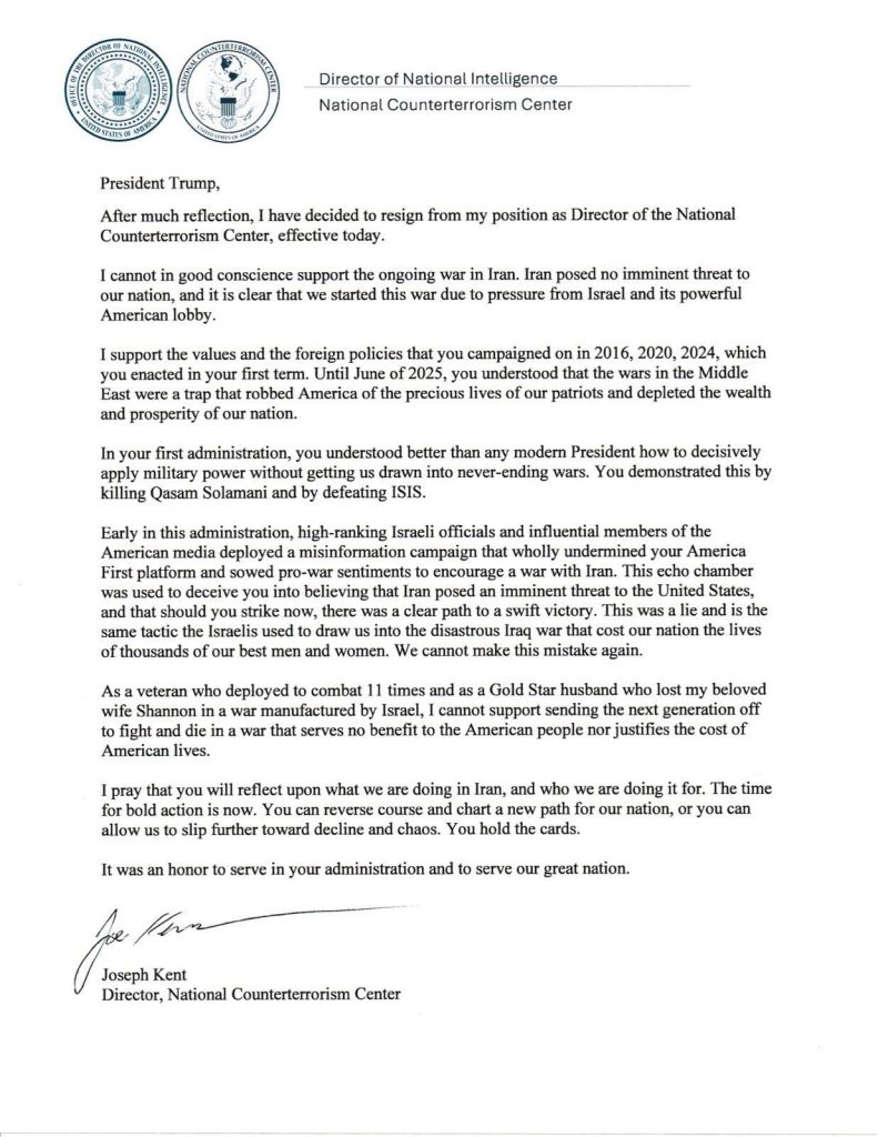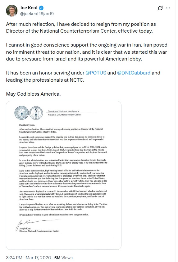 Într-o scrisoare postată pe X, directorul Centrului Național de Antiterorism, Joe Kent a declarat că Iranul nu reprezintă „o amenințare iminentă” pentru SUA și a susținut că Administrația Trump „a declanșat acest război din cauza presiunilor exercitate de Israel” și a lobby-ului său american puternic.