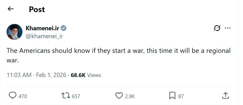 Liderul Suprem al Iranului, Ayatollah Ali Khamenei, a lansat duminică cea mai directă amenințare de până acum la adresa Statelor Unite, conform postării sale pe X.