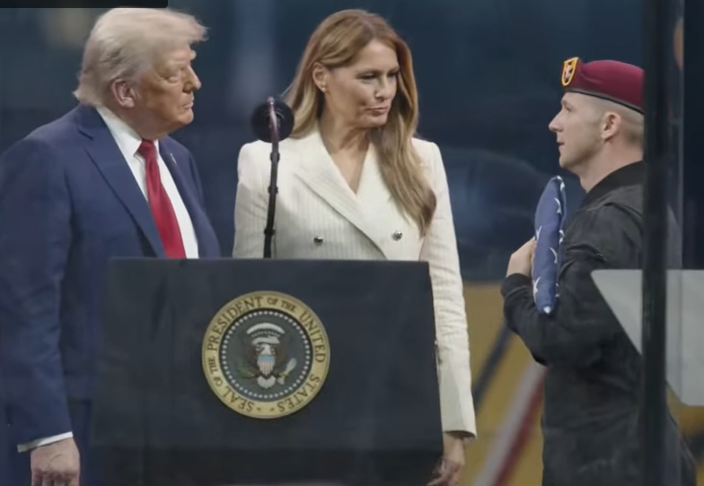 Președintele a mulțumit din nou trupelor și veteranilor, spunând mulțimii că, datorită „serviciului și devotamentului lor extraordinar, 250 de ani mai târziu, America este la înălțime, mândră, liberă“.