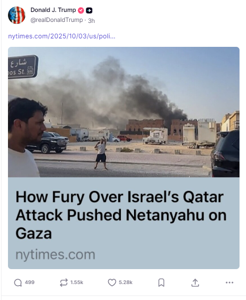 Președintele SUA, Donald Trump, a publicat pe Truth Social un articol din New York Times care detaliază cum furia provocată de atacul eșuat al Israelului împotriva liderilor Hamas din Doha l-a determinat să facă presiuni asupra prim-ministrului Benjamin Netanyahu pentru a pune capăt războiului din Gaza.