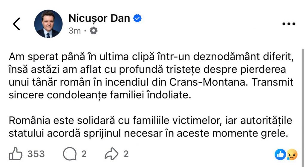 Ministerul Afacerilor Externe transmite condoleanțe familiei îndoliate și subliniază că România face parte din grupul de contact umanitar creat pentru a sprijini autoritățile elvețiene în gestionarea cazurilor persoanelor afectate. Departamentul pentru Situații de Urgență, Ministerul Sănătății și Ministerul Apărării Naționale sunt pregătite să intervină, inclusiv pentru eventuale zboruri medicale speciale, la solicitarea părții elvețiene.