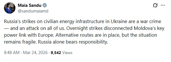 Președinta Maia Sandu a transmis pe X că Rusia poartă întreaga responsabilitate pentru situația actuală. Autoritățile moldovene au pus în funcțiune rute alternative de aprovizionare, însă acestea nu sunt suficiente pentru a garanta stabilitatea pe termen lung.