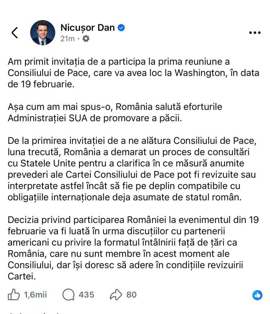 „Am primit invitația de a participa la prima reuniune a Consiliului de Pace, care va avea loc la Washington, în data de 19 februarie. Așa cum am mai spus-o, România salută eforturile Administrației SUA de promovare a păcii.