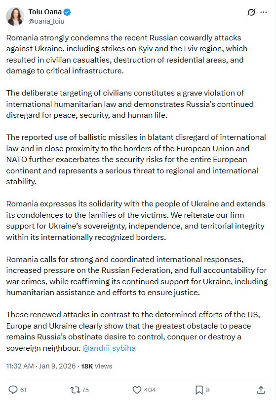 „România condamnă ferm recentele atacuri lașe ale Rusiei împotriva Ucrainei, inclusiv loviturile asupra Kievului și a regiunii Lviv, care au dus la victime în rândul civililor, distrugerea zonelor rezidențiale și avarierea infrastructurii critice.