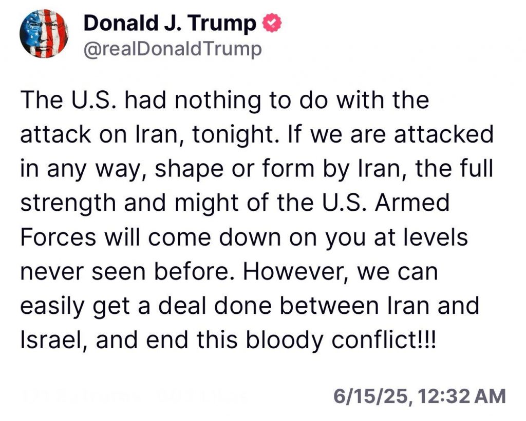„Dacă suntem atacați în vreun fel, formă sau formă, de către Iran, întreaga forță și putere a Forțelor Armate ale SUA se va abate asupra voastră la niveluri nemaivăzute până acum”, a declarat Trump într-un mesaj pe Truth Social. „Cu toate acestea, putem încheia cu ușurință o înțelegere între Iran și Israel și putem pune capăt acestui conflict sângeros”.