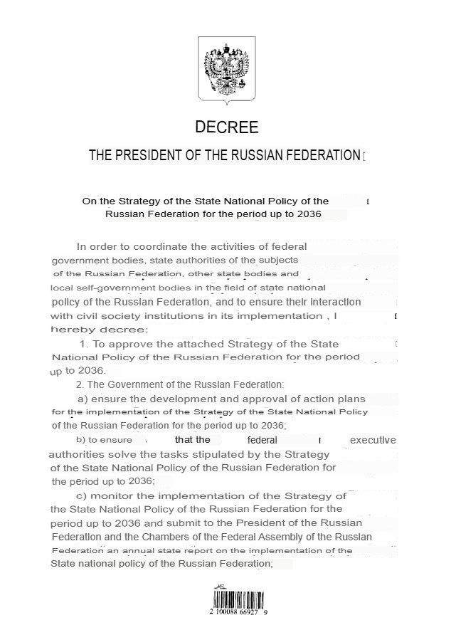 Acesta subliniază necesitatea „adoptării unor măsuri suplimentare pentru consolidarea identității civice ruse în ansamblu”, promovarea folosirii limbii ruse și combaterea „eforturilor statelor străine ostile de a destabiliza relațiile interetnice și interconfesionale și de a crea diviziuni în societate”.