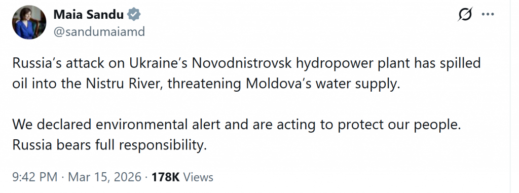 Bombardarea hidrocentralei de la Novodnistrovsk a provocat o scurgere masivă de petrol care a ajuns în albia fluviului Nistru. Președintele Maia Sandu a anunțat instituirea unei perioade de alertă de 15 zile, timp în care autoritățile depun eforturi disperate pentru a limita impactul asupra consumatorilor.
