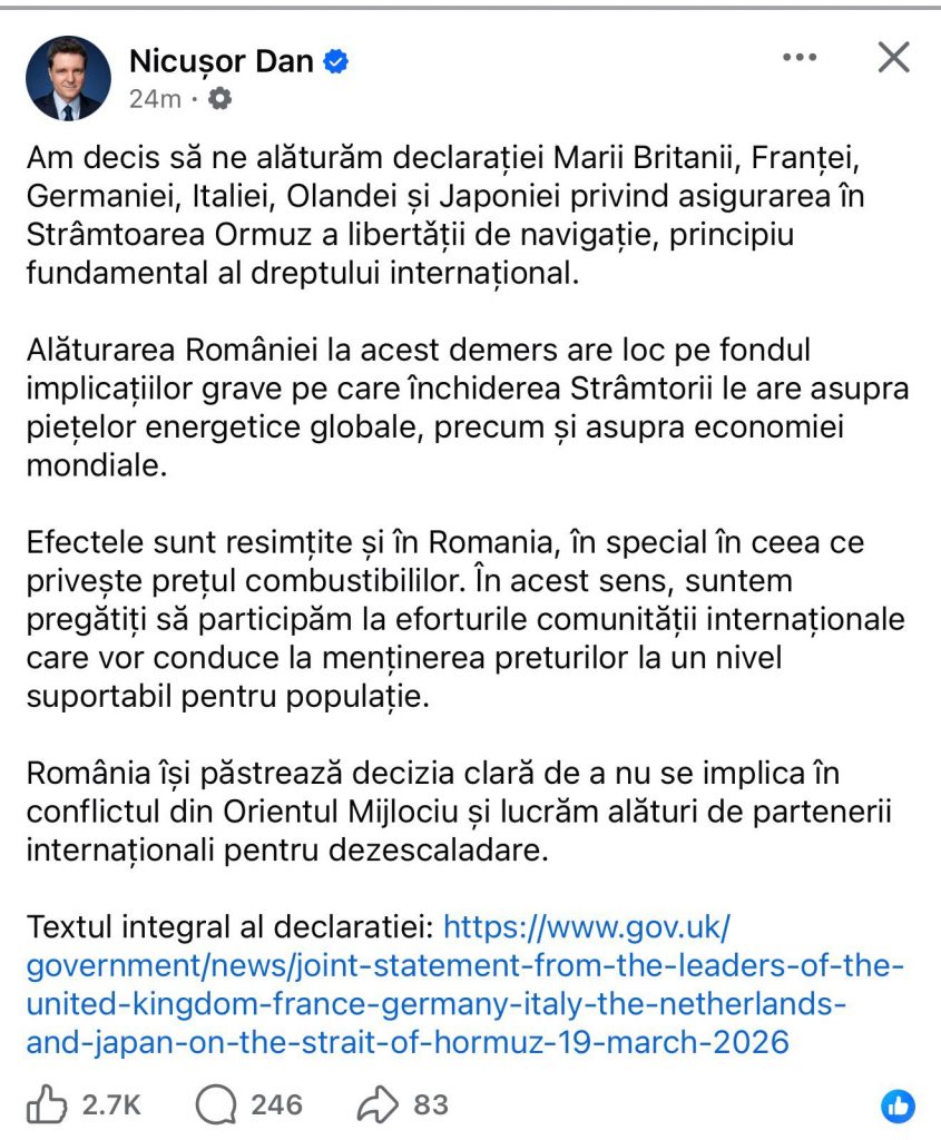 „Am decis să ne alăturăm declarației Marii Britanii, Franței, Germaniei, Italiei, Olandei și Japoniei privind asigurarea în Strâmtoarea Ormuz a libertǎții de navigație, principiu fundamental al dreptului internațional. Alăturarea României la acest demers are loc pe fondul implicațiilor grave pe care închiderea Strâmtorii le are asupra piețelor energetice globale, precum și asupra economiei mondiale.