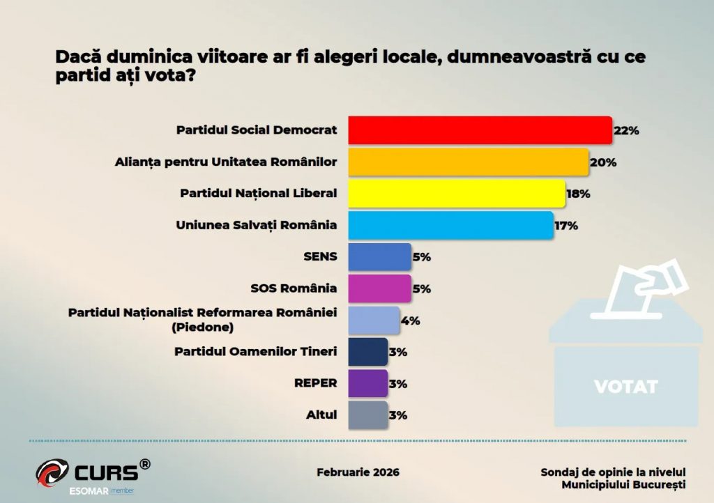 În ipoteza organizării unor alegeri locale duminica viitoare, Partidul Social Democrat ar obține 22% din voturile bucureștenilor, fiind urmat de Alianța pentru Unitatea Românilor, cu 20%.