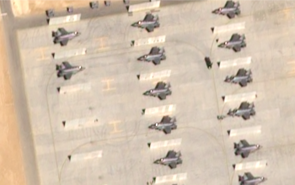 Fotografiile arată și avioane moderne, inclusiv F-35 stealth, care nu apar frecvent în imaginile anterioare ale bazei. Mai multe drone și elicoptere sunt vizibile în perimetrul instalației. Unele aparate de luptă par amplasate sub adăposturi, ceea ce indică posibilitatea ca numărul real să fie mai mare decât cel observat direct.