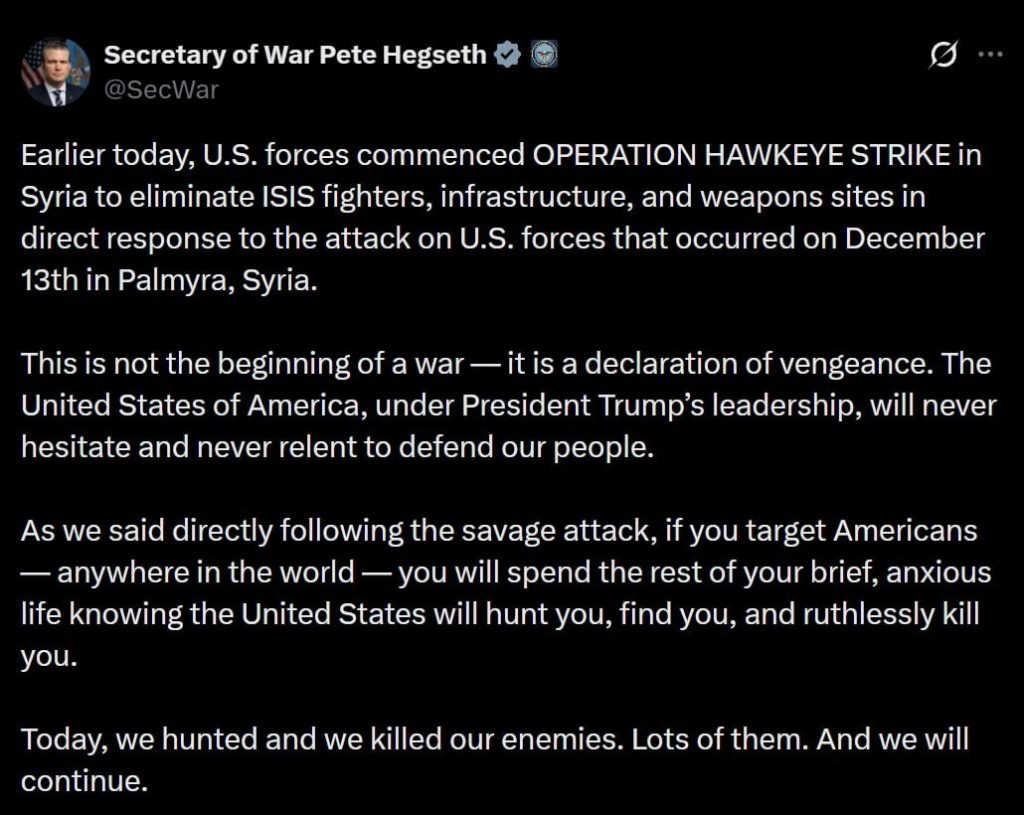 Hegseth a reamintit avertismentul transmis imediat după atacul din Palmyra, descris drept „sălbatic”, adresat tuturor grupărilor care ar putea lua în calcul atacarea intereselor americane.