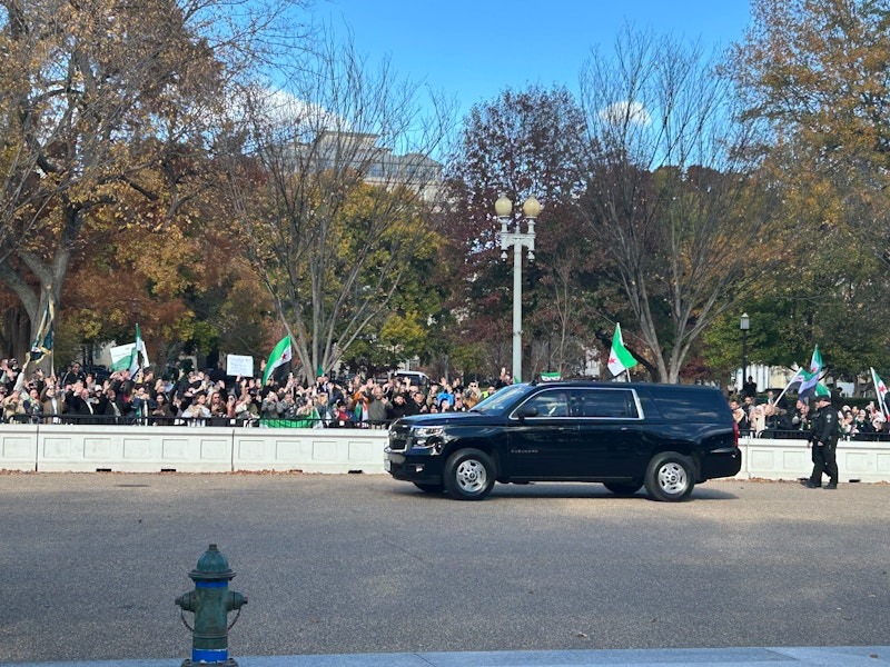 Sharaa a salutat mulțimea pro-Siria adunată afară, pe Pennsylvania Avenue.