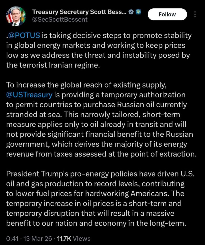 - Departamentul Trezoreriei SUA, condus de Scott Bessent, a emis o autorizație temporară care permite țărilor terțe să achiziționeze petrol rusesc deja încărcat pe vase, pentru a stabiliza piața energetică globală.