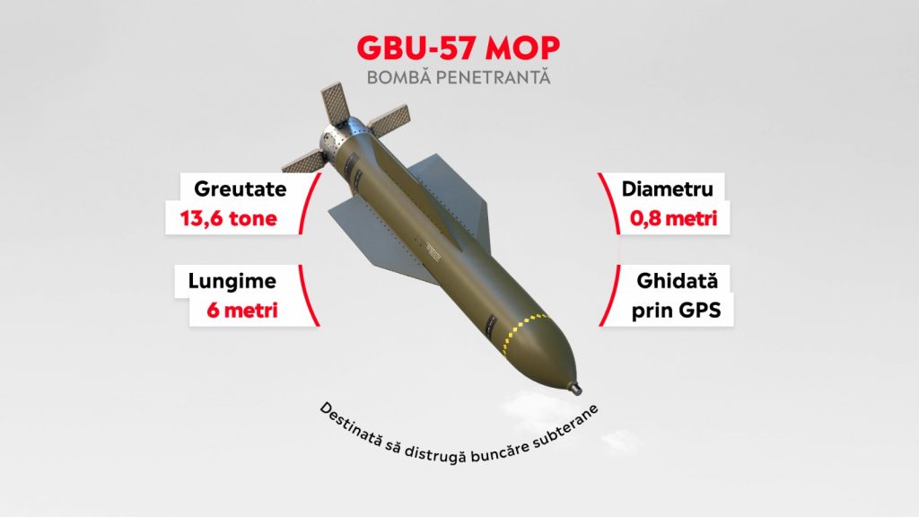 Bomba GBU-57 are un focos convențional, non-atomic, și se crede că poate pătrunde la aproximativ 61 de metri sub suprafață înainte de a exploda, iar bombele pot fi lansate una după alta, forând efectiv din ce în ce mai adânc cu fiecare explozie succesivă.