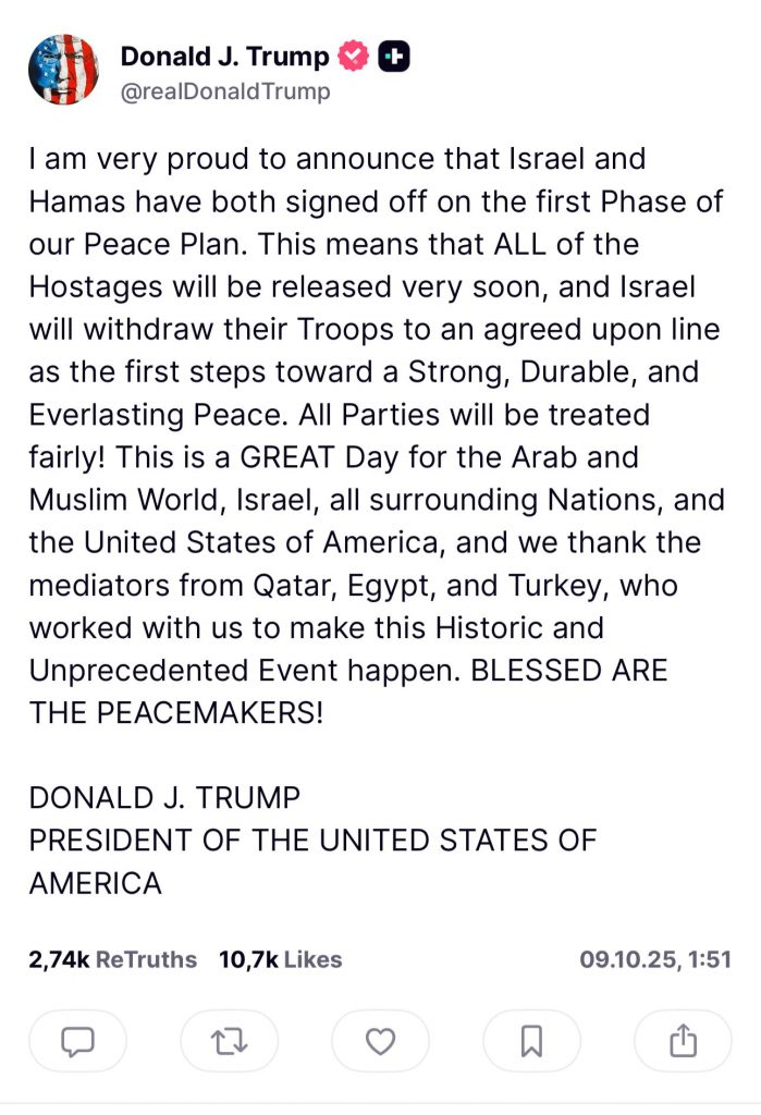 „Sunt extrem de mândru să anunț că Israel și Hamas au semnat prima fază a Planului nostru de Pace”, a scris Trump pe Truth Social. „Toți ostaticii vor fi eliberați în curând, iar trupele israeliene se vor retrage la o linie convenită”.