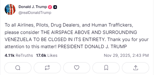 Într-o postare pe Truth Social, Trump a scris: „Către toate companiile aeriene, piloți, traficanți de droguri și traficanți de persoane, considerați SPAȚIUL AERIAN DEASUPRA ȘI ÎN jurul VENEZUELA ÎNCHIS ÎN TOTALITATE”.